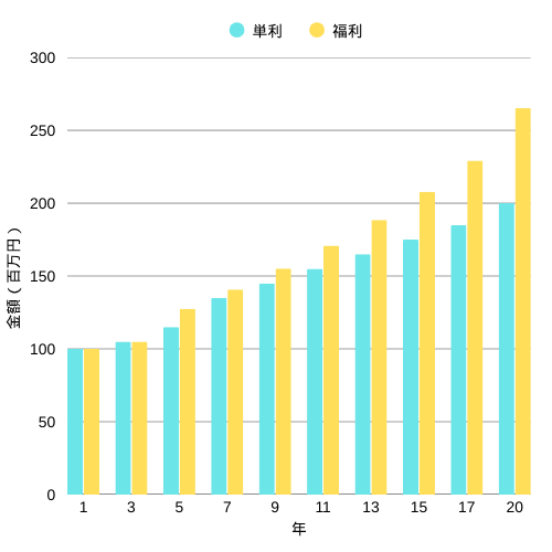 例えば100万円を年5%で20年運用したとしよう。単純に計算すると200万円だけど、複利で回すと約265万円になる。65万円の差は“お金がお金を生む力”なんだよ。